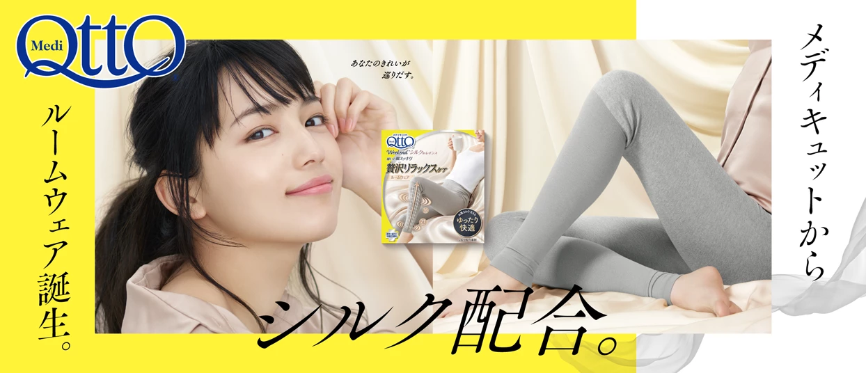 メディキュットの新商品「ウィークエンド シルクインレギンス」のCMに川口春奈さんが出演。
